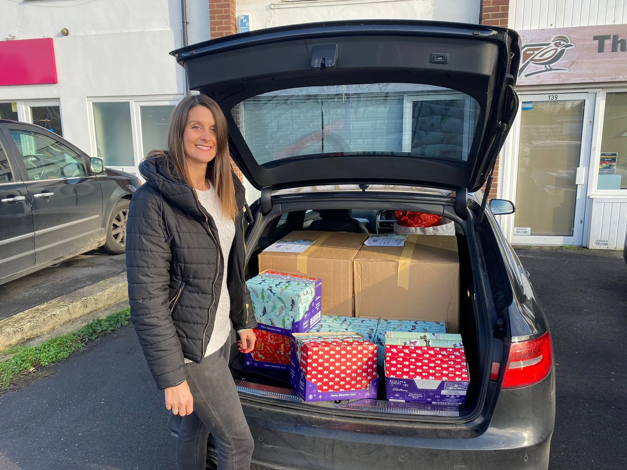 Debbie from Willoughby Primary School with her car loaded with 256 wrapped selection boxes!